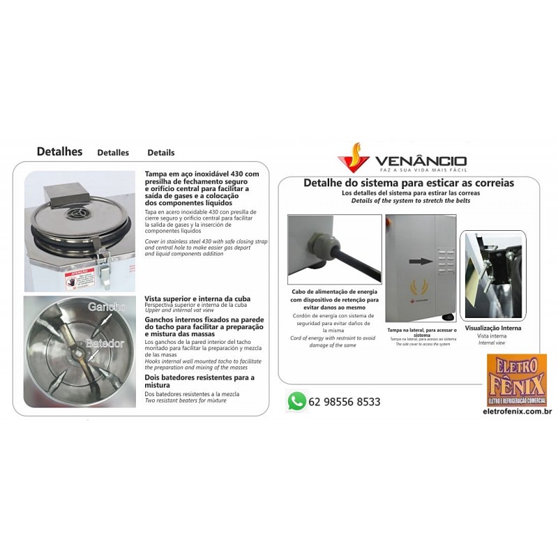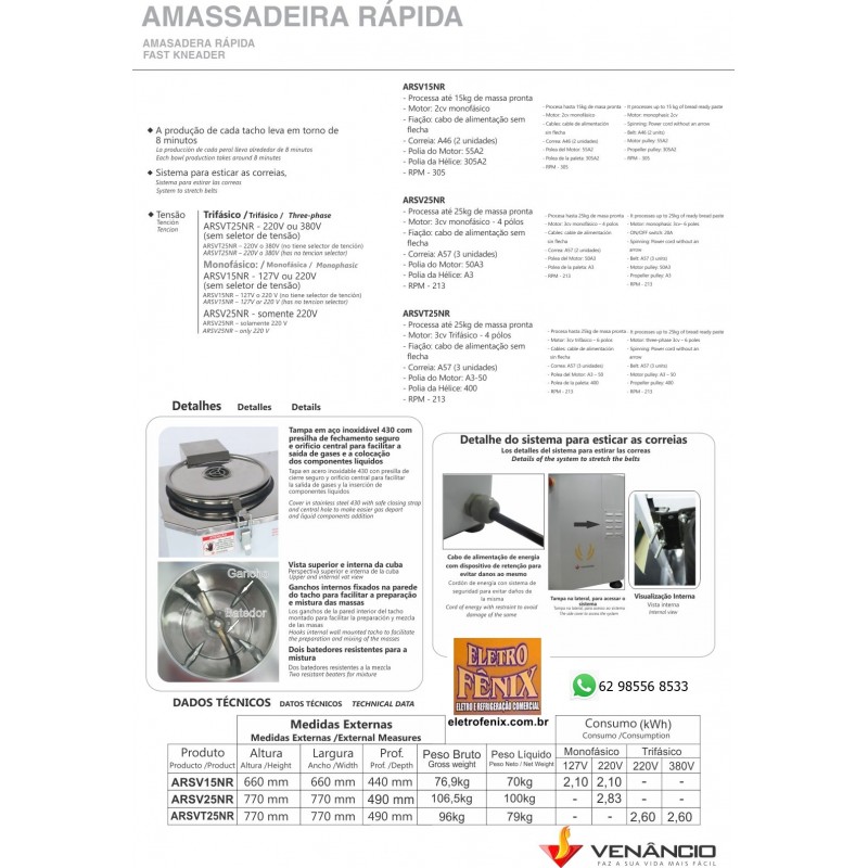 Amassadeira Rápida 15kg Venâncio ARV15NR A Amassadeira Rápida 15kg VenâRncio AVS25NR, é de fácil instalação, manutenção simples e barata.Mais rapidez no preparo de suas massas, levando em torno de 8min a produção de cada tacho.