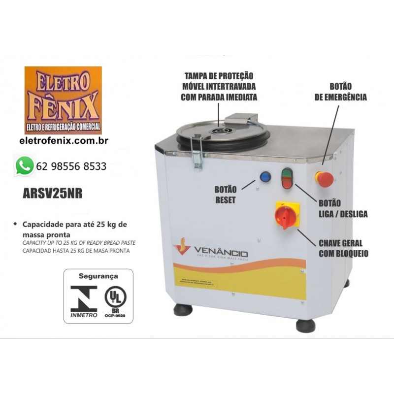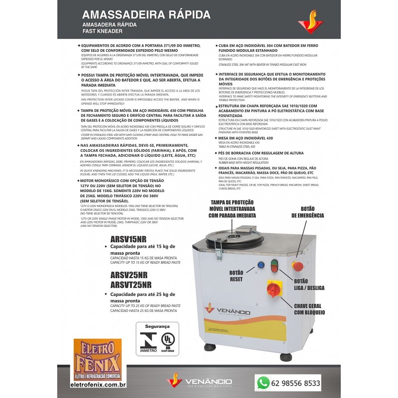 AMASSADEIRA SEMI-RÁPIDA BASCULANTE DE 25KG COM SISTEMA DE SEGURANÇA NR12 VENÂNCIO Equipamentos de acordo com a Portaria 371/09 do INMETRO, com selo de conformidade expedido pelo mesmo.
