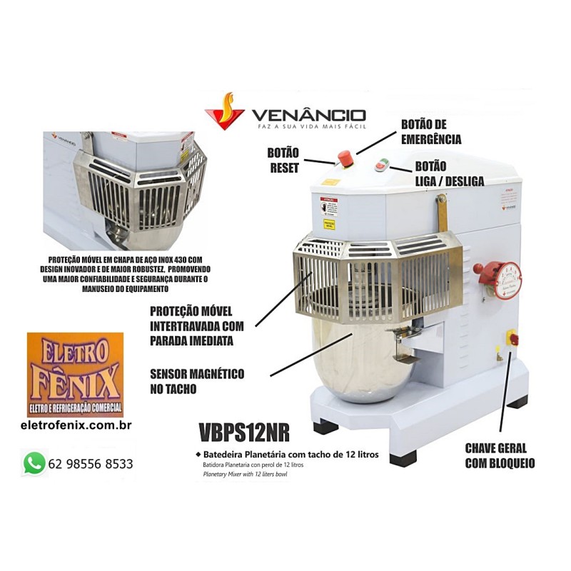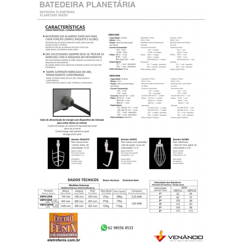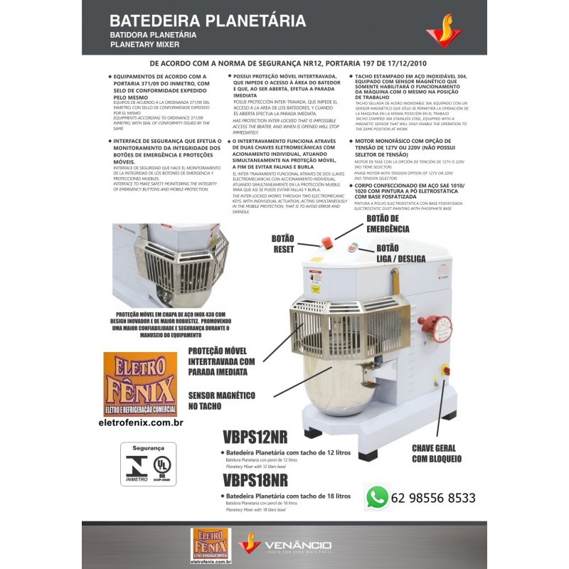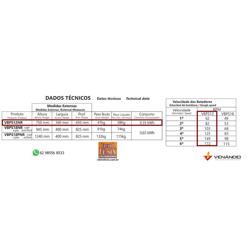 Batedeira Planetária 12 Litros 6 Velocidades Industrial Venâncio VBPS12NR