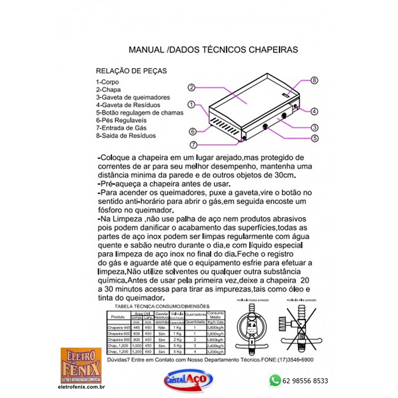 Chapeira profissional confeccionada em chapa aço inox, dotada de queimadores em sistema U, com controle individuais para cada queimador, chapa de manipulação na espessura de 5,2mm, alimentação em gás GLP em baixa pressão.
