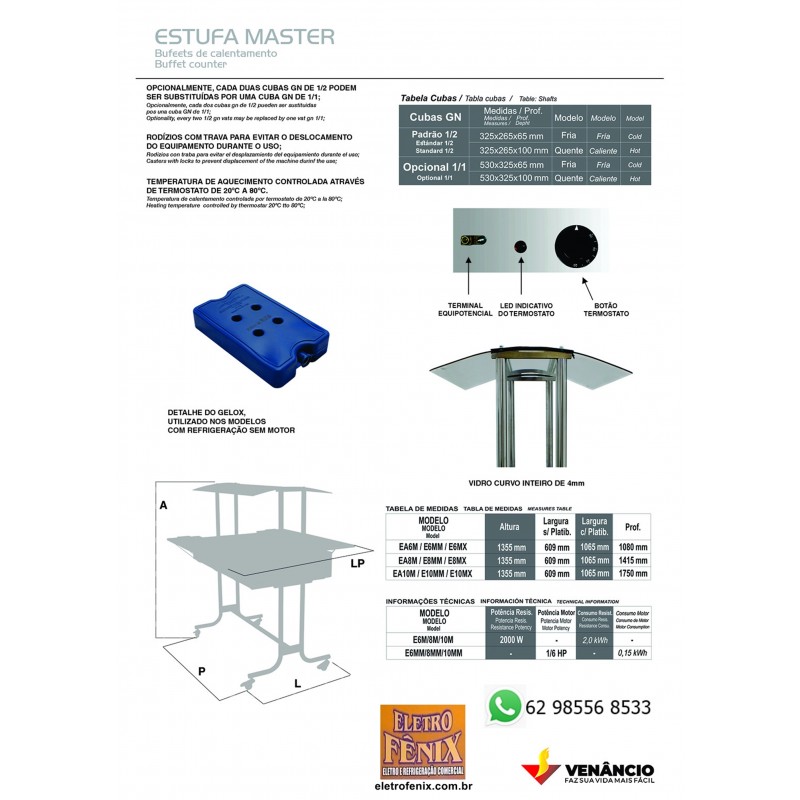 Desenvolvida para conservar a temperatura dos alimentos, a Venâncio apresenta a ESTUFA DE AQUECIMENTO 8 MASTER INOX CUBAS GELO-X - E8MX VENÂNCIO . Esse equipamento possui o selo de conformidade do INMETRO, o que assegura sua qualidade. Para preservar os alimentos em baixa temperatura, o aparelho possui uma placa Gelo X. O modelo ainda conta com sistema de platibanda. Assim, pode-se também ser usado como cobertura para as cubas GN. Através da cobertura de vidro curvo inteiro de 4mm, fica fácil ter a visão total dos alimentos à disposição bem como garantir a higiene. Além disso, a estufa possui rodízios com travas, desta forma evita o deslocamento do aparelho durante o uso. Tudo isso, para agilizar seu trabalho e atestar bem estar aos usuários.