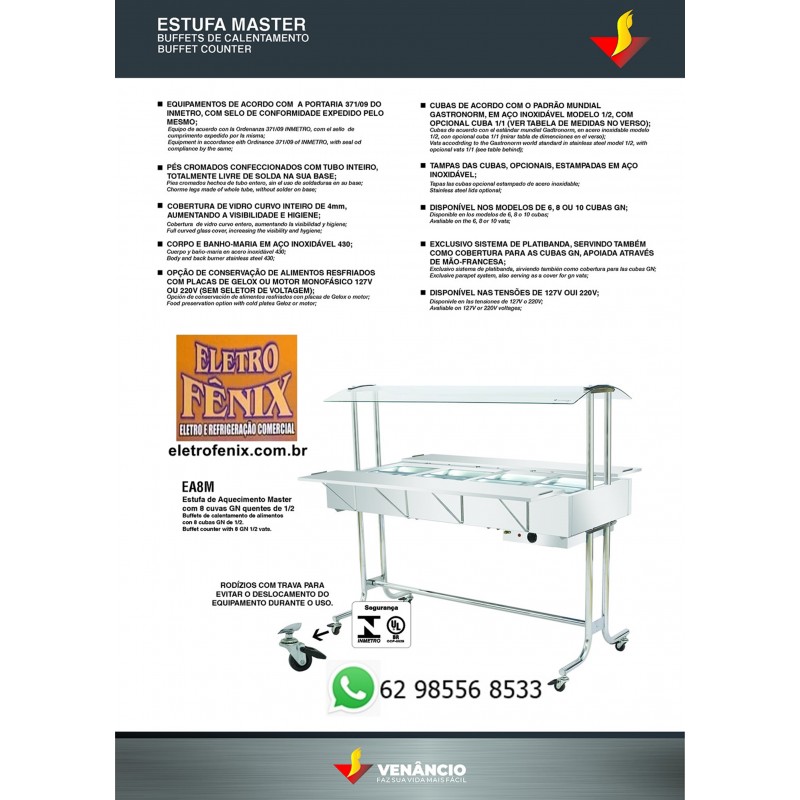Estufa de Aquecimento - 8 Cubas - Venancio Estufa de Aquecimento Master Inox - 8 Cubas - Venancio Equipamento de acordo com a Portaria 371/09 do INMETRO, com selo de conformidade expedido pelo mesmo; Temperatura de aquecimento controlada por termostato de 20º à 80ºC.