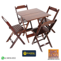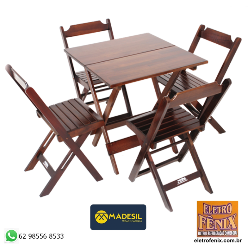 Conjunto dobrável composto por 1 mesa de 0,70x0,70cm e 4 cadeiras. Todo em madeira maciça: Madeiras Mistas (tauari, jequitibá, roxinho, angelin e outras). Ideal para bares, restaurantes, hotéis, casas, festas, clubes, boates, etc. Elegante e prático, o conjunto se adequa a qualquer ambiente, deixando-o bonito e apresentável.